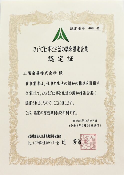 『ひょうご仕事と生活の調和推進企業』として認定していただきました。